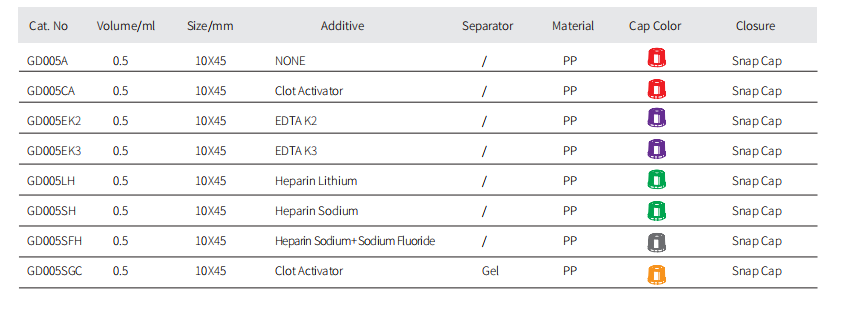 A mikro vérgyűjtő cső egy kis vérgyűjtő cső, amelyet kis mennyiségű vérmintákra terveztek. Általában a mikro-vérgyűjtéshez használják, általában 0,5 ml ~ 2 ml, és alkalmas olyan forgatókönyvekre, ahol csökkenteni kell az összegyűjtött vérmennyiséget, például az újszülött szűrést vagy a nagyfrekvenciás megfigyelést, például a vércukorszintet és a vérrutinot.